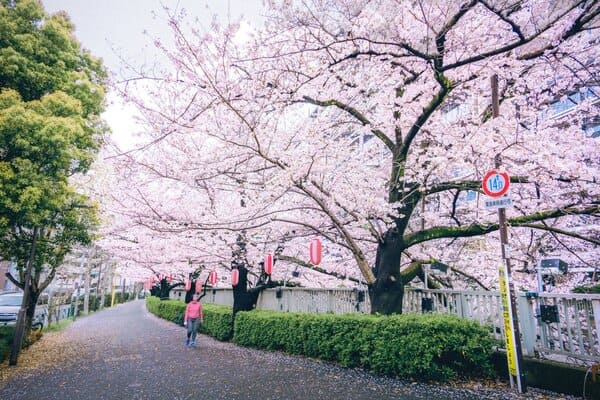 桜がトンネルのように広がる区間では、頭上いっぱいに広がる花びらを楽しめます。