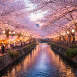 温泉街の灯りと桜のコントラストは、ちょっと特別な春の時間を感じさせてくれます。